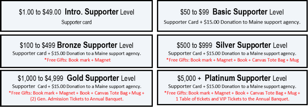 - A bonus in joining us at the basic level or higher, we will donate $15 to the Maine Support Agency of your choice. Each year, your donations allow us to donate to help support different Maine pro-life agencies and their important work.